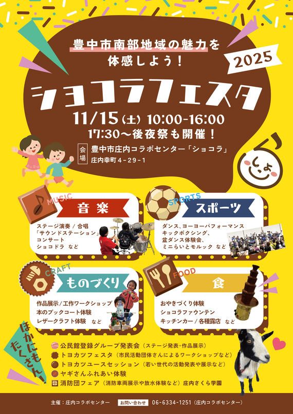 内容:庄内コラボセンターをフィールドに、どきどきワクワクの1日。ショコラ内の各施設イベントや地域団体・事業者による露店、展示・発表などが盛りだくさん。音楽・スポーツ・ものづくり・食をテーマに、さまざまな催しを開催!